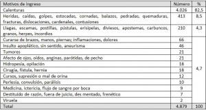 En cuanto a los motivos de ingreso referidos, se pueden realizar las siguientes consideraciones. La hipótesis etiopatogénica de las fiebres o calenturas —de difícil diagnóstico diferencial al ser la clínica muy similar—, se basaba en la teoría miasmática vigente en la época, atribuida a las emanaciones pútridas originadas por la descomposición de las aguas, del aire o de cualquier sustancia orgánica, motivadas por los cambios atmosféricos o climáticos, tanto en épocas lluviosas o calurosas del estío. Por esta circunstancia, en muchas ocasiones se les adjudicaban el apelativo de «estacionales» y para su prevención se colocaban productos aromáticos en los locales.