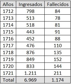 Tabla 2: Enfermos ingresados y fallecidos (1712-1721).