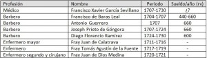 En la tabla 3 se refieren los profesionales sanitarios encargados de la asistencia del hospital durante el periodo comprendido entre los años 1707 y 1730.