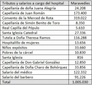 Tabla 4: Tributos, censos y salarios pagados por el hospital (9 junio 1719).