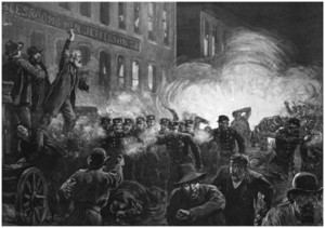 Grabado de 1886 con Samuel Fielden dirigiéndose a los obreros.
