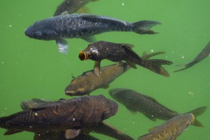 Ejemplo claro de aguas eutróficas en un estanque, con elevada cantidad de algas, y escasez de oxígeno.