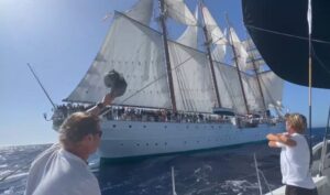En la mañana de este viernes 19 de julio, entre Lisboa y el Cabo de San Vicente, en medio del Atlántico, el Buque Escuela Juan Sebastián Elcano se ha cruzado en la mar con el Maxicat Victoria de Alex Pella, durante su intento de récord de vuelta a España a vela.