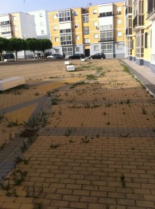 La hierba crece en la plaza Victoria Eugenia, sin que los servicios de limpieza hagan algo por evitarlo y es que los recortes sólo van encaminados a los funcionarios y presupuestos, pero no a la hierba que crece.