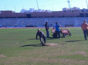 El personal de Mantenimiento del Estadio Iberoamericano,en plena faena de resiembra y recuperación del maltrecho césped.Comentan que la resiembra y mejora del mismo,se hace todos los años en Noviembre-Diciembre aprovechando el parón y la climatología,pero que este año con las lluvias caídas en los últimos días y la intensidad de los entrenos, han dejado al terreno de juego en muy mal estado . Por ello están tratándolo para que este en perfectas condiciones lo antes posible.Por ello , el equipo entrenará en estos días en el campo de G.E. Bazán ó en Gomez Castro.