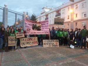 Este es el aspecto que presentaba la entrada a la escuela oficial de idiomas en la tarde de ayer. Allí estaban alumnos y profesores protestando (cosa cada vez más normal en estos días) por los recortes del Gobierno y que cada vez afectan a más centros, colectivos,asociaciones etc. Ellos piden sobre todo una educación pública de calidad y sobre todo están contra la LOMCE (Ley Orgánica de Mejora de la Calidad Educativa) en la que según expertos ,reduciría bastante las Ciencias generales por una Ciencia mucho más especifica que al final, lo que lograría, es que solamente estudiaran ciencias los alumnos que se sientan atraídos por ella y no a todos los niveles de cultura general.