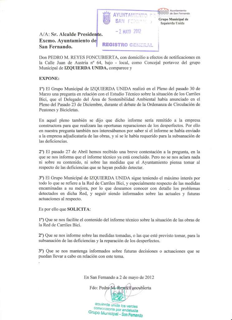 IU abunda que "en el Pleno del 23 de diciembre de 2011, es decir hace casi un año, y durante un debate sobre la Ordenanza de Circulación de Peatones y Bicicletas, el señor Romero, Delegado del Área de Sostenibilidad Ambiental dijo que su área estaba a punto de finalizar un estudio técnico sobre la ejecución de los carriles-bici, como paso previo a exigir a la empresa adjudicataria de las obras que realizara las oportunas reparaciones de los defectos del carril.
