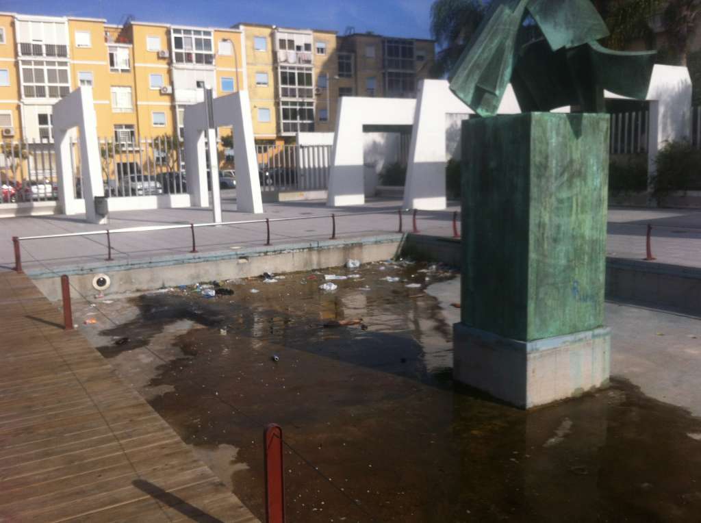 Esto es lo que se pregunta cualquier viandante que pasa por esta plaza,ya que el estado en el que se encuentra actualmente es penoso y de una dejadez total.Los pantalanes de maderas rotos o faltándoles trozos, con lo que a horas en las que la luz no es muy buena,cualquiera puede tropezar y llevarse un "susto",ademas donde antes había agua y mosquitos,ahora sólo hay basuras, restos de maderas y piedras.Algunos chavales, hasta juegan al fútbol en su interior.En fin esperemos que no caiga en saco roto y se lo pasen a mantenimiento de jardines.¿No?