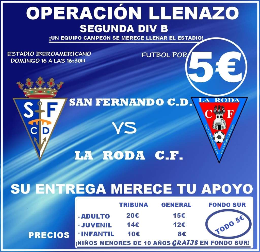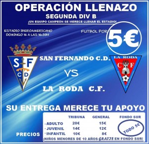Esta es la intención que tienen en el club azulino para el encuentro de la próxima jornada ante La Roda CF ,y que se disputará el próximo domingo a las 16.30 horas. La Junta Directiva ha considerado oportuno adelantar 30 minutos el encuentro por las previsiones climatológicas. Para este partido,la Junta Directiva del San Fernando C.D. , ha estimado conveniente crear una localidad única de Fondo (adulto, juvenil e infantil) al precio de 5 euros. Los niños menores de 10 años en dicha localidad tendrán acceso gratuito. El Fondo Sur (el del marcador) será la ubicación de dicha localidad única. Si hiciese falta el club habilitará los dos fondos,cosa que esperamos que ocurra lo que daría al estadio un magnifico aspecto y los jugadores estarían mucho más arropados.Para facilitar la forma de adquirirlas, se venderán por las mañanas en la Sede Oficial del Estadio Iberoamericano 2010 y durante todo el día en "Cuarenta calentitos y el botellín", en plena calle Real, frente a la Plaza del Rey.Otro dato importante a destacar ,es que estas localidades de fondo,no se venderán en taquillas el día del partido.