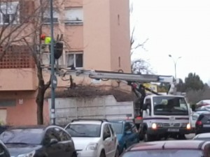 Continúa la poda de árboles en la barriada Andalucía y en las inmediaciones del campo de fútbol de  Bazán.En la foto ,operarios en plena faena como si de esteticistas de los árboles se trataran.Falta les hacía .
