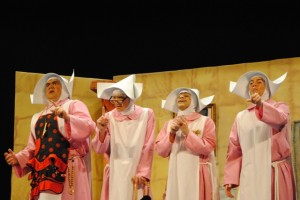 Aparecen en escena dos monjitas preparando dulces en el convento, una gitanita y otra sorda, aparecen dos hermanas más, la superiora y la nueva, la hermana Wendolin, cuya voz le “suena a Vodafone”. La nueva viene de Perú, donde estaba el cobreros, Todos los abuelitos, debido al Parkinson, quieren que la hermana sorderi, les acompañe al servicio. Sigue con las presentaciones a la nueva y ahora toca el turno a la hermana Alegría, que vale para todo. Las presentaciones dan para una parodia poco menos que entretenida, que despiden con música de la mítica película “Sor Citroën”, para dar paso a los cuplés, al que saltó desde la estratosfera con cierta mala leche y al cura del convento al que al tener que operarse, pidieron que aprovecharan y le hicieran la vasectomía. Optan por popurrí, entonado por la hermana sorda, un popurrí cargado de pamplinas,