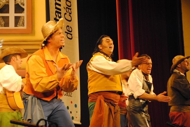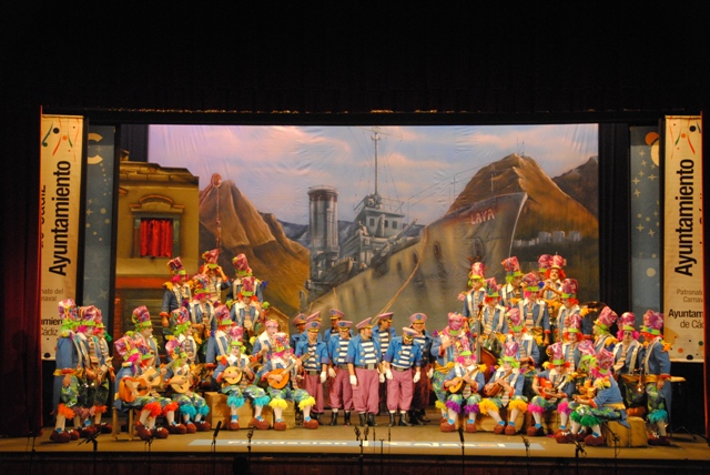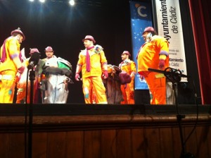 Escenario en penumbra para la comparsa jerezana que cierra sesión esta noche, obreros de que denuncian los problemas sociales y económicos que sufre Cádiz, desde el prisma del obrero al que han despedido de la factoría, nos narran en su presentación. Dan paso a los pasodobles, las injusticias del concurso, del jurado, comprenden el primero, son muchos los que, según ellos, vienen de relleno a este teatro, pues los premios siempre recaen sobre los mismo, y no merece y se les quitan las ganas de venir, pero su música perdurará por siempre en las tablas. El segundo comienza dando fuerte al concurso, esta vez a las letras de aquellas agrupaciones, que simplemente son para ganarse al jurado, al público, cantan por los puntos, dan un giro y terminan advirtiendo a la alcaldesa que no maquille el estado de la ciudad y luche por revivirla. Cuplé a la que restauró el cuadro, del Cristo, que resulta ser un retrato de la alcaldesa, tampoco terminado, y a lo indescifrable que pueden llegar a ser las recetas, eso sí, las pancartas cuando se manifestaron, se entendía perfectamente. Popurrí .flamenquito y con buen ritmo, que para las horas que son, se agradece.