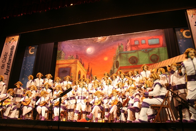 Cambian la disposición de los componentes para este pase de cuartos, y vuelven a la estructura original del coro, por cuerdas, pues tuvieron algunos problemas en preliminares por ello. Suena esa magnífica falseta que traen este año, de las mejores del carnaval sin duda, primer tango homenaje al ex presidente Adolfo Suarez, aquel que dirigió el país en aquellos momentos difíciles como los de la transición, etapa en la que se cambiaron los ideales, las creencias políticas, aquel que sufre la enfermedad de alzhéimer, sobre la cual hablan estos coristas, mejor la mente en blanco que ver como se encuentra actualmente España. Segundo en el que dan fuerte al senntimienrto español, aquel que sólo aparece cada dos años, en mundiales y eurocopas, para eso si son capaces de lanzarse los españoles, y no para defendernos ante Alemania, banderas y sentimientos que permanecen en un rincón el resto del tiempo. Turno para los cuplés, en el primero han encontrado trabajo terminando las obras inacabadas, el segundo puente, la reforma de la sanidad, pero lo que no han podido terminar es la cara de Belén Esteban, segundo a la idea surgida en Japón de eliminar a los mayores, aquí en España eso es fácil, les quitas “Se llama copla”, y se mueren sólos.