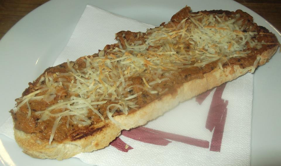 Buena tosta para recuperarse del carnaval,la que nos propone Kuko,elaborada en una tostada de pan de campo hecho en leña con "pringaita" del puchero untada y recubierta de virutas de queso manchego. Todo ello gratinado después y directamente a la boca con un buen vino.Simple y original. En su línea