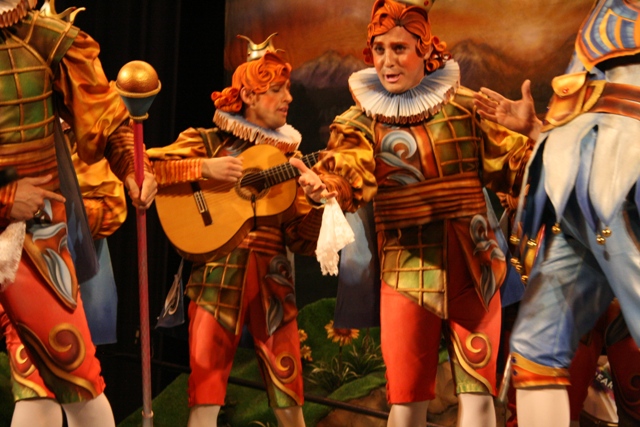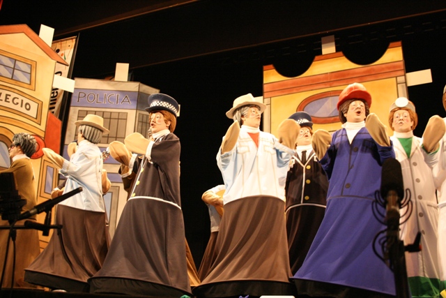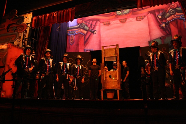 Llega de nuevo la magia al Falla, y lo hace con un truco estelar para comenzar, una guillotina que separa la cabeza del autor de su tronco, a partir de ahí, veremos cómo transcurren los trucos y coplas. Primer pasodoble, con la presencia de los niños, suponemos que los hijos, ataviados con el tipo de la comparsa, adivina adivinanza quien es más comparsista de los dos, quien vive más los ensayos o las letras, es su hija la que presume de la comparsa, orgulloso de su padre ante todo aquel que le hable de carnaval, es al final la primera de sus seguidoras, por ello es por lo que en esta copla ha acompañado a su padre. En el segundo, no es que esté perdiendo el juicio y la cordura, pero es que al ver a los españoles como dejan pasar los días, cargados de insolidaridad, prefiriendo temas más banales, aquellos que ocultan los verdaderos problemas tras un simple programa de entretenimiento o un partido de fútbol, y esto al final, son los que le piden al pueblo que se rebele, que se alce contra los poderes.  En el primer cuplé los deseos de muchos que el truco de la presentación, en el que se guillotina a Aragón, hubiera salido mal, pero entonces a ver a quien le dedica más de uno, medio repertorio, segundo, al espectáculo de Carlinhos Brown de este verano, con baile incluido.
