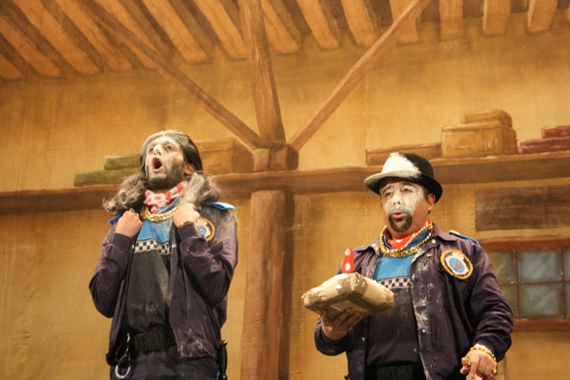 A ver que nos traen hoy estos gitanos metidos, por circunstancias, a policías, su comisario y el resto del plantel. Comienza la parodia con el hijo esperando al papa, que aparece con una cabra, que tienen que cuidar porque su tío está ingresado, también trae la llave de la flagoneta, eso sí, antes de irse tiene, por fuerza que cantar, pero no pueden irse, pues aparece el comisario, que pregunta por la cabra, “es muy lista, dicen, sabe leer, pero no hablar”. El comisario les informa que han encontrado el alijo de cocaína que habían robado, por lo que viene el Rey a darles la medalla al trabajo, aunque sin querer, prueban la droga y los efectos de esta son peligrosos.., que no le hablen de canciones le advierten al comisario pues se pueden arrancar a cantar, en esos momentos llega su majestad, que claro, da pie a diversas canciones, los gitanitos se arrancan con todo. Vamos con los cuplés, primero a la organización de la procesión magna que hubo este verano, todas las cofradías quisieron acudir, todas menos la Sagrada cena, pues “comer en la calle y dos veces, sale muy caro”, segundo a los platos típicos de cada lugar de España, con final infiel entre su mujer y lo que le da su vecino canarios. En el tema libre, aparece el “papa”, que se ha liado con la mujer del comisario, al ir a recoger el “suero de la verdad”, que le ha pedido el comisario, con el que se pincha el papa. A continuación se va a interrogar al confidente, al que le cuenta toda la verdad. Con una sentida cuarteta defendiendo la modalidad, que no se está convirtiendo en un teatro, si no que avanza con los tiempos, pero siempre respetando a los maestros de los que han aprendido, terminan su actuación.