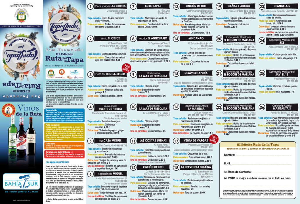 La III Ruta de la Tapa comienza el 17 de mayo y estará vigente. La Delegación Municipal de Turismo ha dispuesto de una guía de lo más práctica en la cual se ofrecen todos los detalles de esta iniciativa, establecimientos participantes, promociones, premios así como un mapa de la ciudad donde se sitúan todos los establecimientos. En este caso habría que destacar que la Ruta registra un nuevo éxito de participación en lo que bares, restaurantes y cafeterías se refiere, hasta un total de 26.