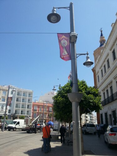 Operarios municipales han colocado esta mañana unos gallardetes con una custodia para que el centro de San Fernando luzca de forma espléndida.  Con ello y las banderas colocadas ante la Iglesia Mayor han comenzado los preparativos de la solemnidad.