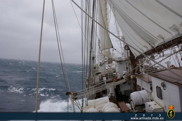 Desde entonces han transcurrido 24 singladuras, en las que se han navegado 3.060 millas náuticas y en las que además se ha conseguido el récord de velocidad del presente crucero: el pasado miércoles se alcanzaban 13,7 nudos cuando se navegaba con olas de 6 metros y viento entablado de 45 nudos con rachas de hasta 55 nudos (unos 100 km/h).