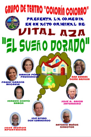 El próximo sábado 22 de Junio, a las 22 horas, en la Peña “Chato de la Isla”, tendrá lugar la representación teatral, a cargo del Grupo de Teatro “Colorín Colorao”, de la Peña C.C. Colorín Colorao, presentando la Comedia en un Acto y en prosa, original de VITAL AZA, Titulada “EL SUEÑO DORADO” bajo la Dirección de ANTONIO MUÑOZ y con el siguiente reparto: