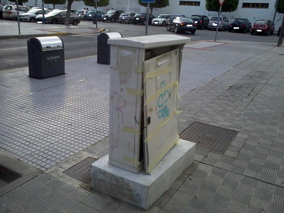 De peligro eléctrico podríamos hablar al ver el estado en que se encuentra este "cuadro eléctrico o contador" que se encuentra en las inmediaciones del Centro Plaza.Y peligro porque por esa zona además transitan muchas personas y niños, sí niños que con su inocencia y con un descuido de sus padres pueden acceder al interior de él y provocar un accidente.Además,la seguridad en el cierre del mismo no creo que sea la cinta carrocera que tiene actualmente puesta y que no impide el acceso a su interior.No sabemos de quien es la responsabilidad de que esté en este estado,pero lo que sí es cierto es que puede provocar lo que en esta bendita tierra conocemos como "un disgusto".