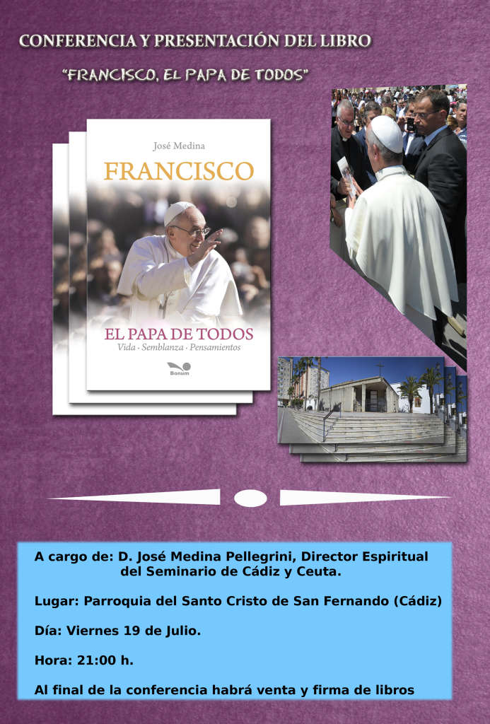 Cartel Presentacion'Francisco, el Papa de todos' es el libro del colaborador directo del Cardenal Bergoglio, cuando era Arzobispo de Argentina, José Medina Pellegrini, director espiritual del Seminario de Cádiz y Ceuta, que será presentado este viernes día 19 de julio a las 21:00 horas en la Parroquia del Santo Cristo.