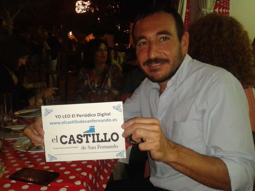 20130715_001517El delegado del Gobierno de la Junta de Andalucía en Cádiz, Fernando López Gil lee el Castillo de San Fernando y en la cena con la que su partido compartió con los medios de prensa en la caseta del pueblo ,posó con el cartel para que se sepa. Como podemos ver cada día somos más.