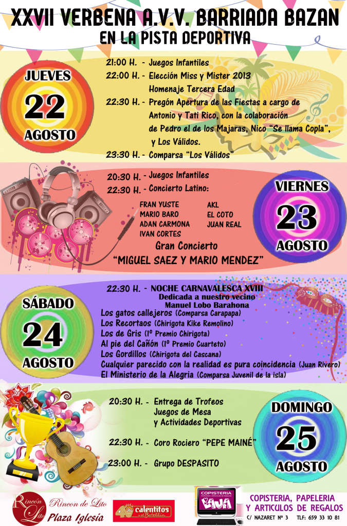 Mañana jueves en la AVV Bazán comenzará la XXVII Verbena de la Barriada que como se sabe, fue suspendida en su fecha inicial de Julio por el trágico accidente de Santiago de Compostela.