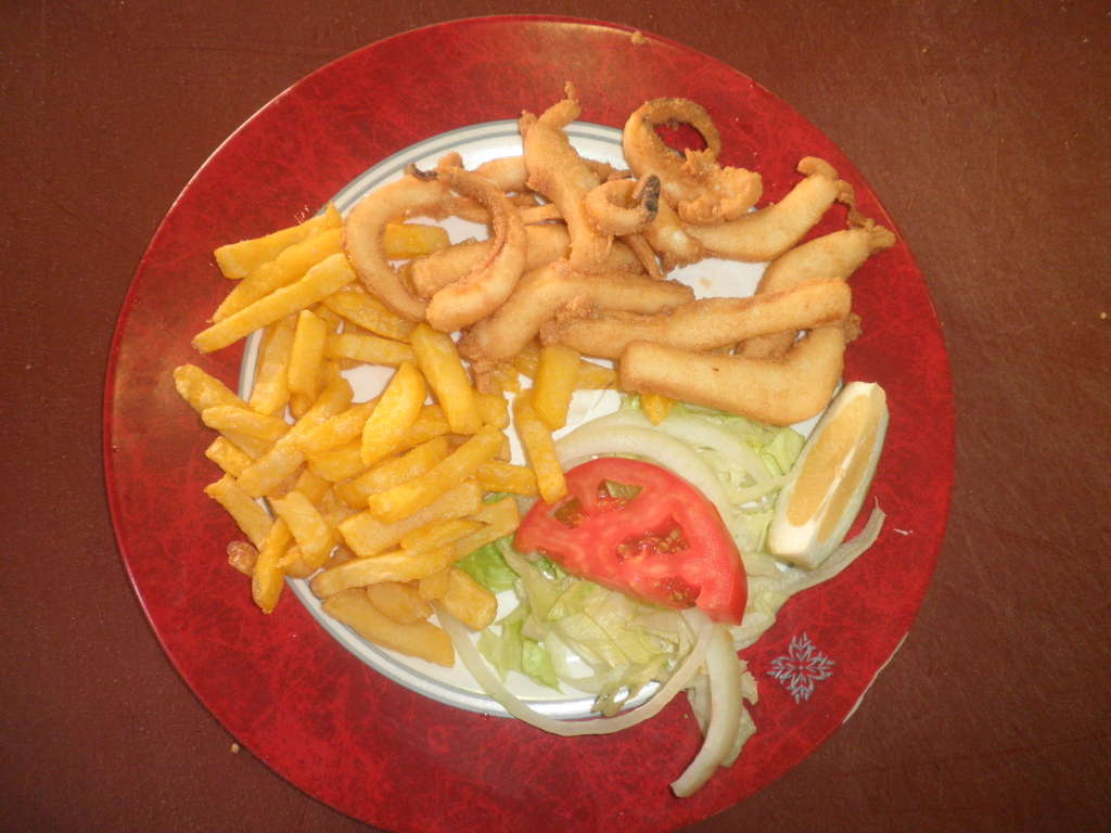 Chocos fritos tradicionales con chips y ensalada del "Sancho Panza"