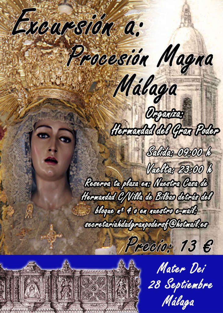 excursionEl próximo día 28 de septiembre con motivo de la procesión Magna que tendrá lugar en la ciudad de Málaga la hermandad del Gran Poder organiza una excursión. El precio de la misma es de 13 euros. Para reservar plaza pueden hacerlo en la casa de Hermandad en la calle Villa de Bilbao detrás del bloque nº4 o enviar un e-mail a: secretariahdadgranpodersf@hotmail.es
