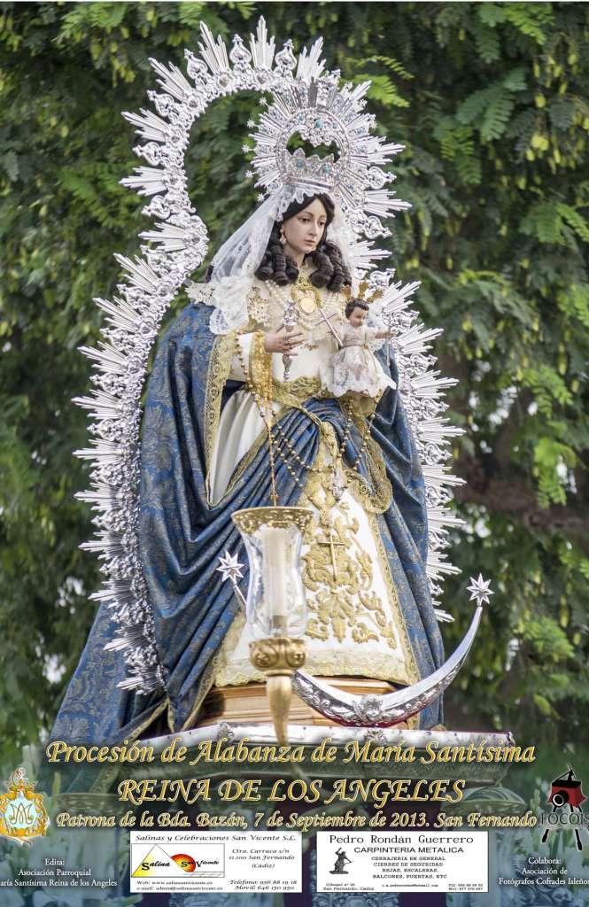 La asociación Parroquial de María Santísima Reina de los Ángeles, para promulgar la devoción a su Amantísima Titular organiza Solemne Procesión de Gloria y Alabanza el próximo sábado día 7 de septiembre a las 19'00 horas. El cortejo procesional partirá desde su sede canónica, la parroquia de la Sagrada Familia, de la barriada Bazán, recorriendo las calles de la feligresía, teniendo previsto su recogida a las 23'00 horas.
