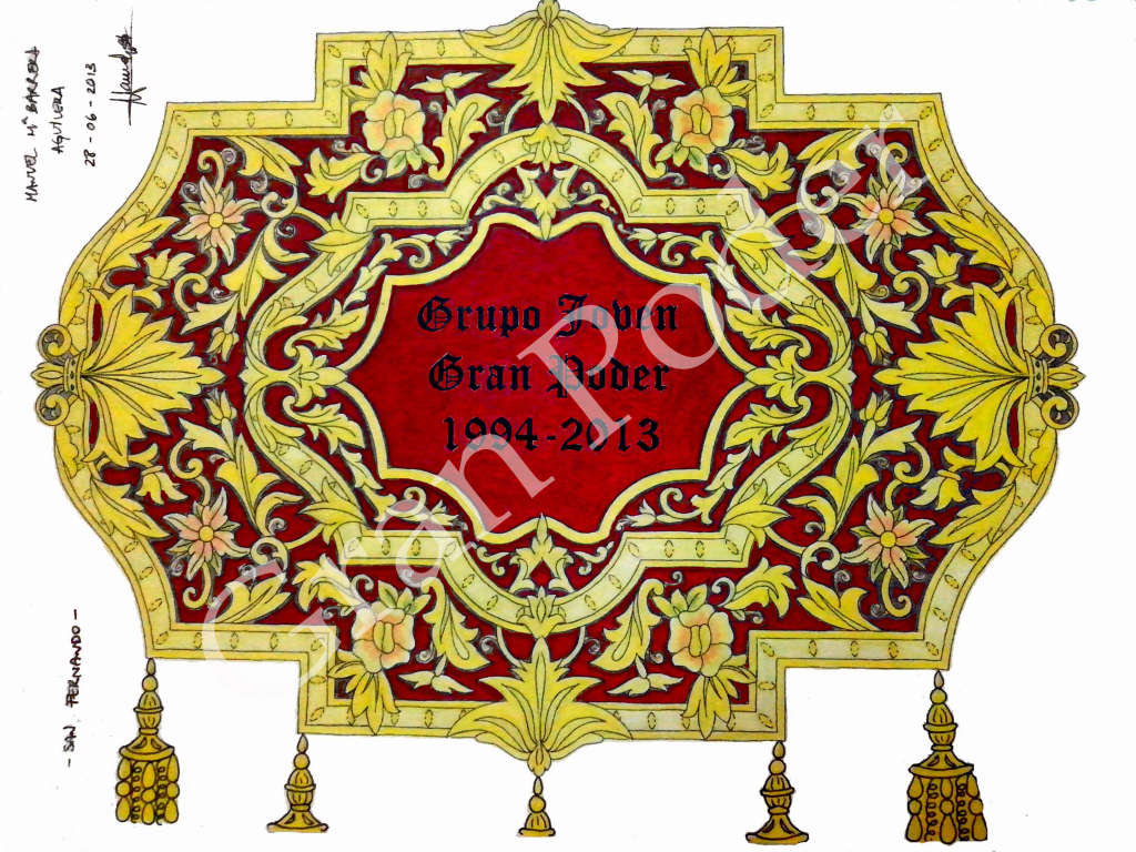 guion grupo joven copiaEl Grupo Joven de la Hermandad del Gran Poder ha presentaso el boceto de su nuevo Guión que pasará a sustituir el antiguo en el que aún reza el lema "JUNTA AUXILIAR".  El boceto y bordado del nuevo Guión del Grupo Joven esta a cargo de Manuel Barrera Aguilera, joven bordador de la localidad de Rota, que está trabajando también en el bordado del libro de Hermanos Difuntos de la hermandad. El boceto es una bella obra sobre terciopelo de color corinto, siguiendo así la línea creada por la hermandad en el cortejo procesional y que hace referencia a la Sacramentalidad de la misma. El Grupo Joven, que ya participara conjuntamente con el Grupo de Devotos de María Stma. del Amor en la donación del cíngulo, ceñidor y actualmente en la confección del nuevo Túnico de Ntro. P. Jesús del Gran Poder, comienza este importante proyecto realizando diversas actividades para recaudar fondos para poder hacer frente a la ejecución del mismo.