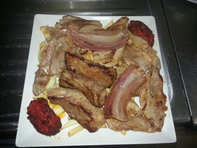 El plato que nos presenta son una elección exquisita, que sin duda preparados al punto, hace que sea una delicia para muchos; panceta, secreto, pluma, presa, filetes, chorizo y como no, con sus patatas fritas.
