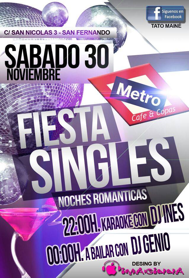 1459799_1414417242127530_2004482998_nDesde hace tiempo estos dos grupos, Singles y Noches Románticas van recorriendo diferentes locales de la provincia. Cada vez son más las personas que se unen a estos eventos tan bien organizados y donde la música es indispensable. Esta vez se reunirán en la Isla, en el bar El Metro de San Fernando. Calle San Nicolás nº 3.