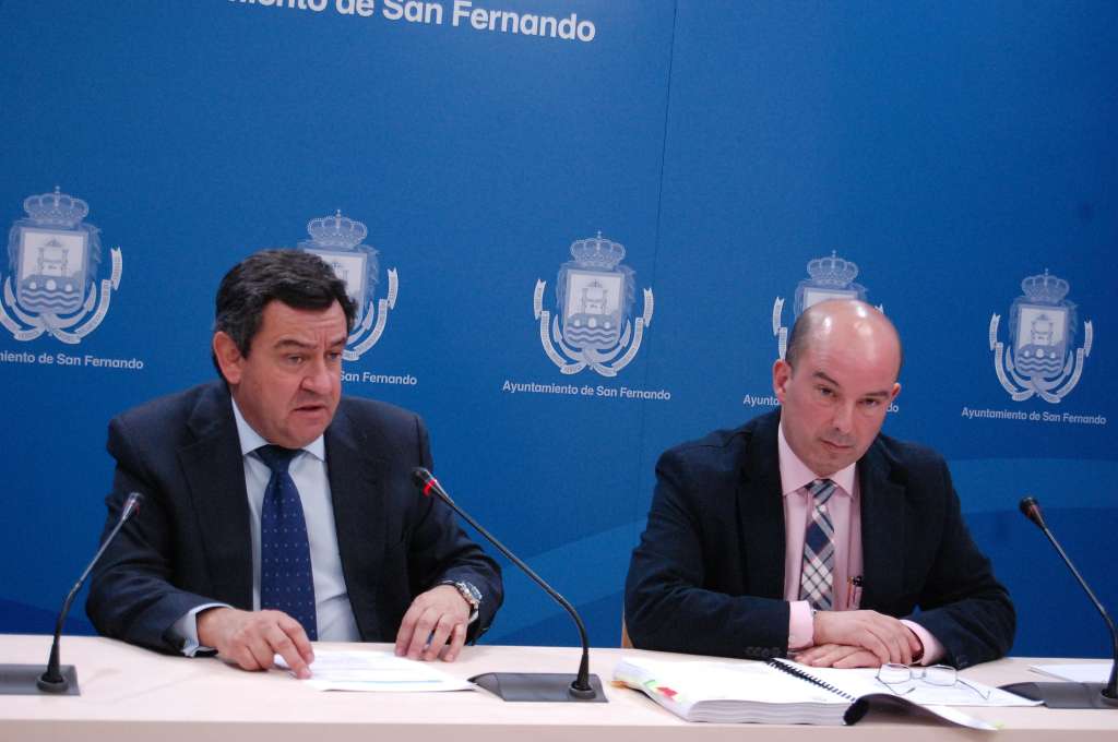 El alcalde de San Fernando, José Loaiza, acompañado por el teniente de alcalde de Hacienda, Manuel Raposo, han presentado hoy en rueda de prensa el documento de los Presupuestos Municipales del año 2014 que se llevarán a Pleno para su aprobación. El Gobierno municipal del PP gastará menos de lo que tiene previsto ingresar durante el próximo ejercicio y además reservará un total de 13 millones de euros para ejecutar tres importantes actuaciones: la rehabilitación del edificio del Ayuntamiento, la subestación eléctrica del Janer y un plan de mejora vial, que se acometerá en toda la ciudad.