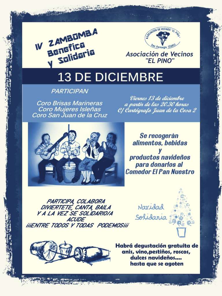 IVZAMBOMBArepartirSobre las 20.30 horas la Asociación de Vecinos “El Pino” llevara a cabo su IV Zambomba benéfica en la Barriada “El Pino” en la Calle Cartógrafo Juan de la Cosa 2.