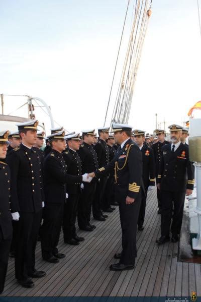 Junto a los alumnos de La Graña, han embarcado los guardiamarinas de las promociones 415 del Cuerpo General de la Armada y 145 de Infantería de Marina que, por primera vez, recibirán a bordo enseñanza universitaria correspondiente al título de grado en ingeniería industrial de la rama de mecánica. Por este motivo han embarcado profesores del Centro Universitario de la Defensa adscrito a la Escuela Naval Militar.