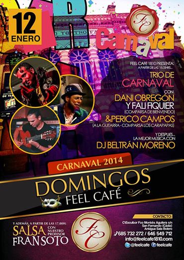 comparsa Bienvenido; cantarán Dani Obregón, Fali Figuier y de la comparsa Los Carapapas; Perico Campos a la guitarra.