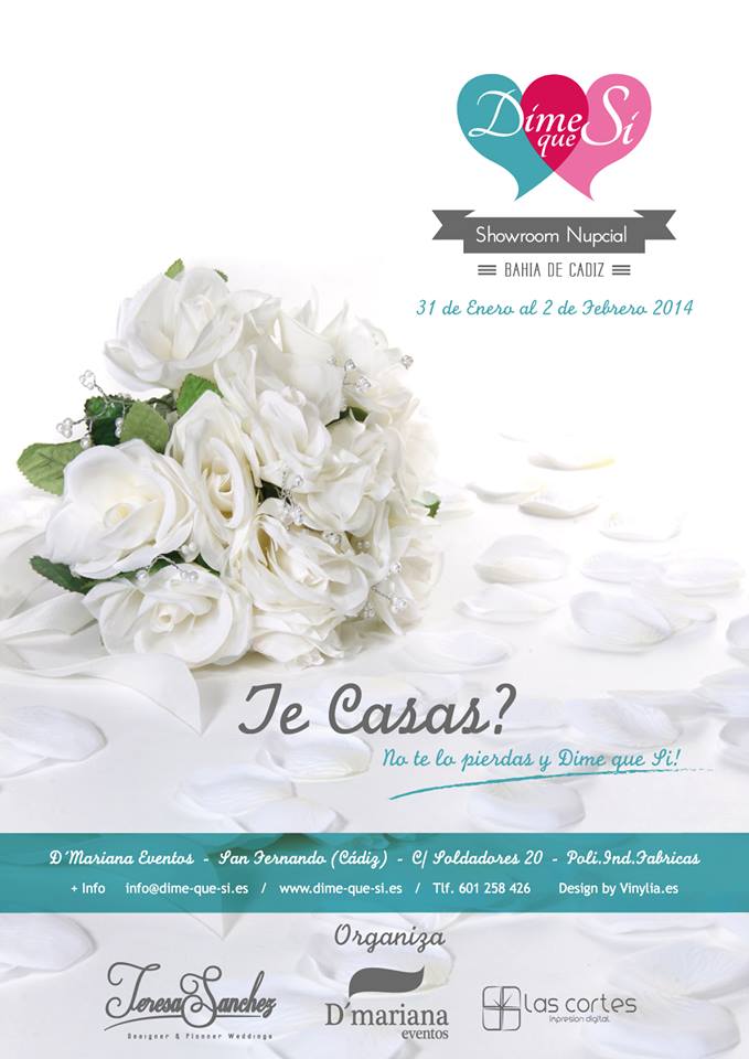 A partir de mañana, 31 de enero a las 17 horas, hasta el 2 de febrero a las 21 horas tendrá lugar en San Fernando frente al CC Bahía Sur en las instalaciones de D'Mariana Eventos La Terraza el “I Showroom Nupcial Bahía de Cádiz” Díme Que Sí. Entrada libre. Donde se expondrán diferentes productos y servicios relacionados con la organización de bodas.