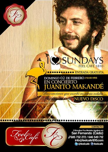 Este domingo 2 en la sala Feel Café San Fernando, ubicado en la calle Escritor Fco Montes Aguilera, a partir de las 18h, actuación de Juanito Makandé presentando su nuevo disco "Las canciones que escribí mientras volaba". Entrada gratuita.