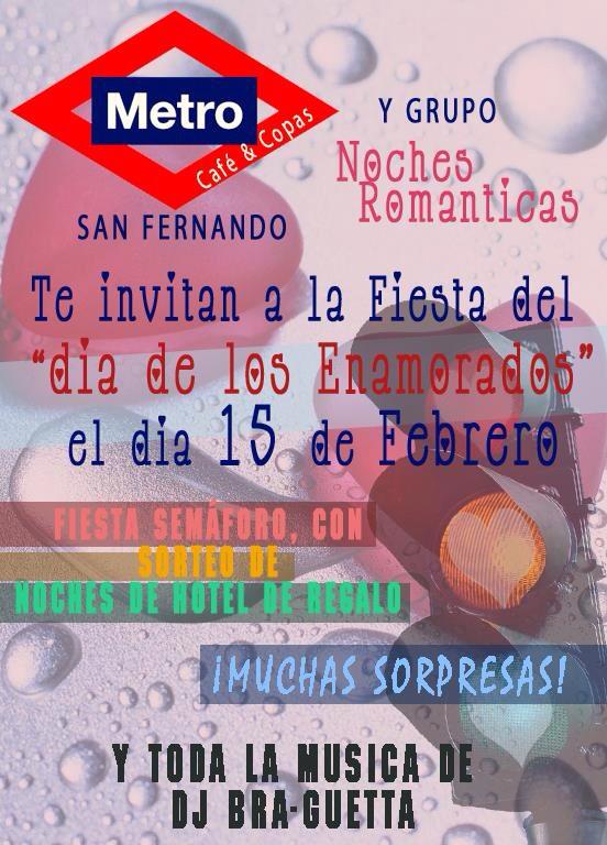 Con motivo del día de los enamorados, “Singles” y el grupo “Noches Románticas” organizan su propia fiesta, este sábado a partir de las 23 horas en El Metro de San Fernando en la calle San Nicolás nº 3. Precio de entrada 10 €; dos copas o tres refrescos y sorteo de dos noches de hotel.