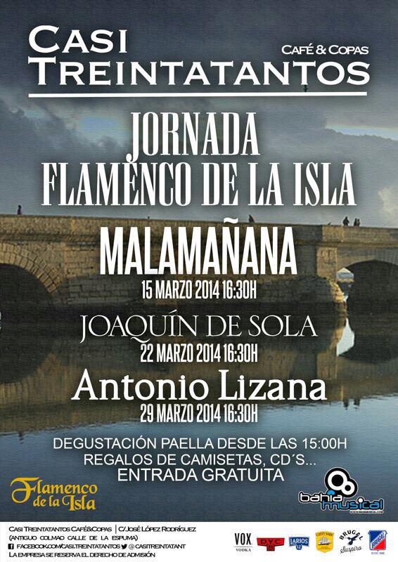 En el Café & Copas Casi Treintatantos en la calle José López Rodríguez, este sábado 15 de marzo, a partir de las 16.30 horas, comienza la " JORNADA DE FLAMENCO DE LA ISLA, en Casitreintatantos", con el grupo flamenco-fusión Malamañana. Entrada libre.