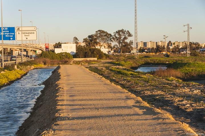 Pero ¿Cuál no ha sido mi sorpresa? que en uno de mis paseos fotográficos, por los senderos del Parque Natural, me he encontrado con la construcción de un carril, de casi metro y medio de altura sobre el nivel de los caños, que une el Molino de Mareas de Rio Arillo con los terrenos de la antigua Escuela de Tiro Naval Janer, atravesando toda la salina de los Tres Amigos, paralela a la N IV ¡¡Están construyendo un carril en mitad del Parque natural!!, claro que no sé si en esa parte del parque en concreto, descansan, anidan, crían, se reproducen o mueren, las aves que impiden que los isleños tengamos, de una vez por todas, un acceso digno, fácil y seguro a nuestra playa, una playa que dicho sea de paso, nos costó para conseguirla años de lucha y disputas con el Ministerio de Defensa.