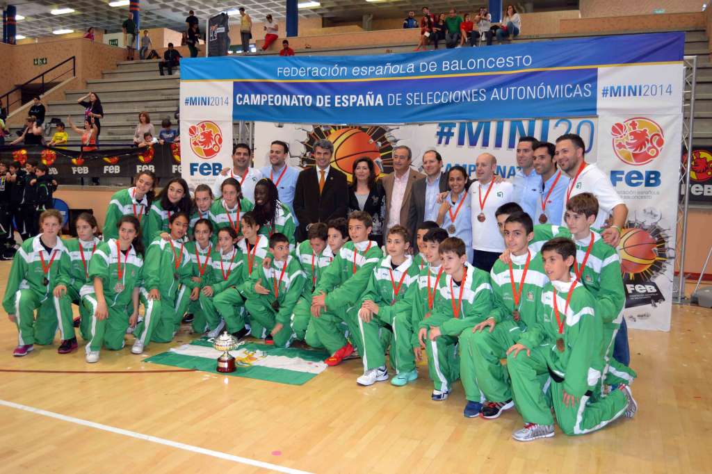 El primer teniente de alcalde y delegado municipal del Área de Promoción de la Ciudad, el andalucista Francisco J. Romero; y la Delegada Municipal de Deportes, María Jesús Ortega, han presidido por parte del Ayuntamiento el acto de entrega de premios del Campeonato de Selecciones Autonómicas Masculina y Femenina de Minibasket 2014, que ha tenido lugar esta mañana en el Pabellón de la Ciudad Deportiva de Bahía Sur y que también ha contado con la presencia del Presidente de la Federación Española de Baloncesto, José Luis Sáez; el Vicepresidente de la Federación Española de Baloncesto, Juan Martín; el Presidente de la Federación Andaluza de Baloncesto, Antonio de Torres; y los populares y reconocidos ex jugadores de baloncesto Fernando Romay, Jorge Garbajosa y Elisa Aguilar.