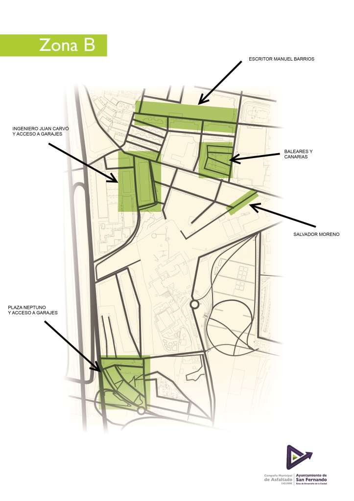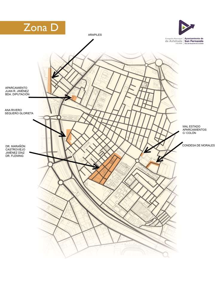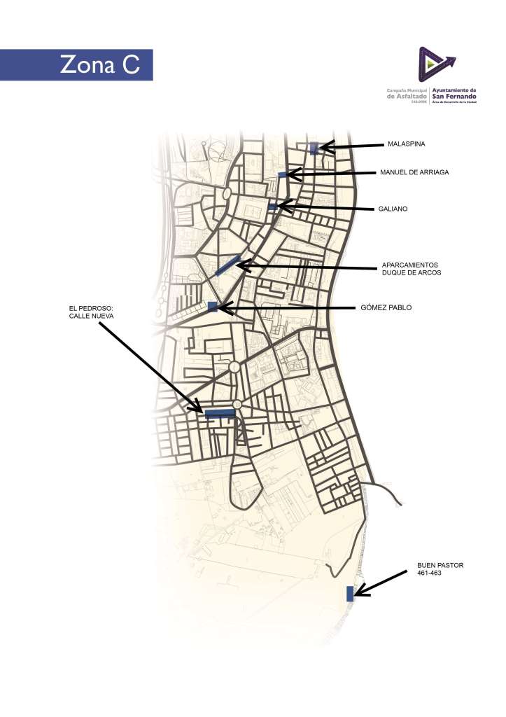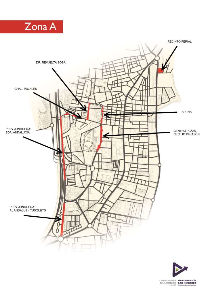 El Plan de Asfaltado se divide en cuatro zonas. La primera, la Zona A incluye: Doctor Revuelta Soba; Centro Plaza-Cecilio Pujazón; Tusquets-Avenida Al-Ándalus; varios tramos dede General Pujales; Pery Junquera, de Barriada Andalucía al Mercadona; El lado izquierdo del Recinto Ferial; y Arenal: aparcamientos y tramos.