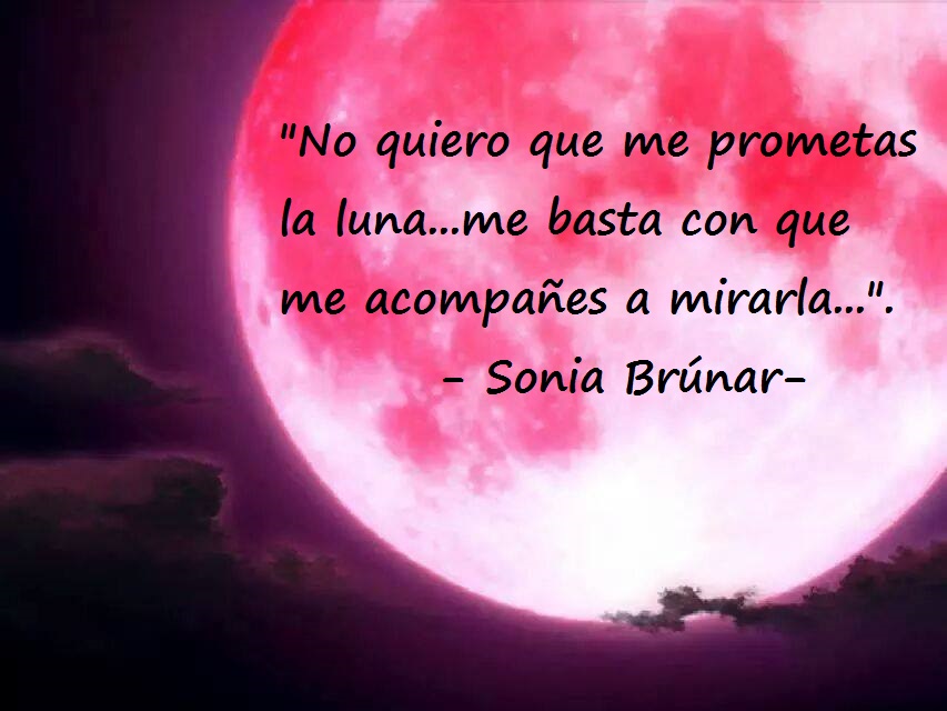 Por eso te pido que dejes de prometerme la luna, que no creas más ser capaz de hacer realidad nuestros sueños, pues los sueños que nosotros compartimos no forman parte de este mundo, no pueden ser iluminados por este sol, no tiene cobijo en la luna que cada noche es testigo de nuestros sentimientos. Si algún día quieres hacer una verdad de este amor tan sólo sonríeme, dame la mano, sé tú mientras me vives y permíteme ser yo mientras vivo por tu alma. Seamos libres y dejemos ser libres a los astros que giran para hacer del amor lo más sencillo y satisfactorio de la vida...