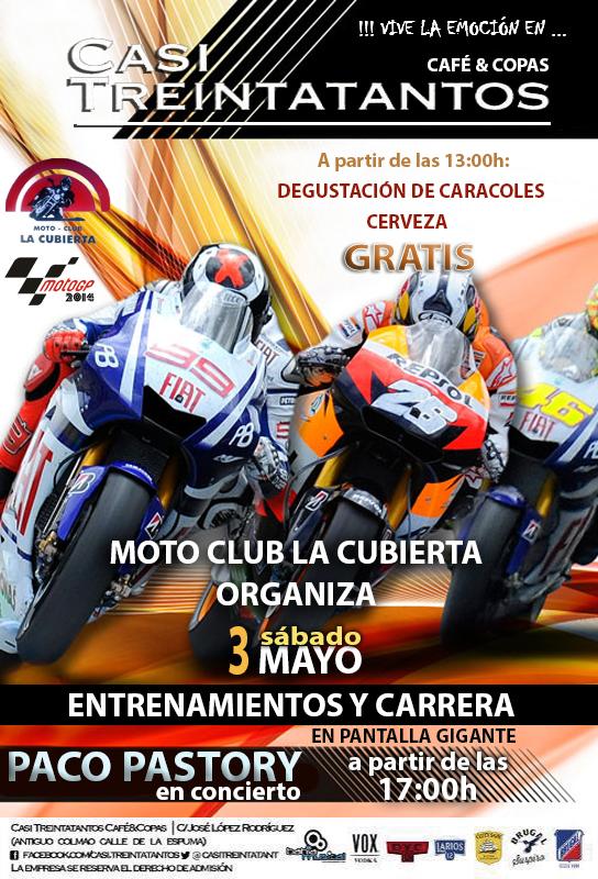 Y el sábado 1 de mayo a partir de la 13 horas, cerveza gratis, degustación de caracoles, y de la mano de Moto Club la Cubierta, y con pantalla gigante, retransmisión de los entrenamientos y carreras de motos 2014 de Jerez de la Frontera.