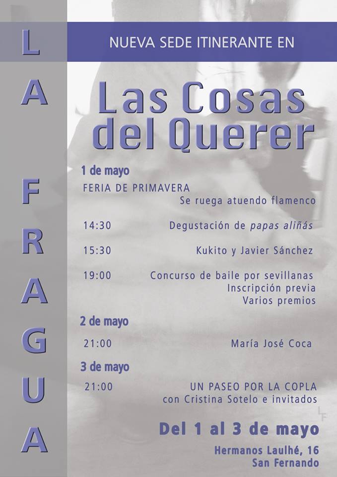 La Asociación Cultural Flamenca La Fragua del 1 al 3 de mayo, tendrá su sede itinerante en el bar, Las Cosas del Querer, en la calle Hermanos Lauhlé nº 16 dando comienzo hoy jueves a las 14.30horas. El bar se vestirá de feria para recibir a todos los asistentes.