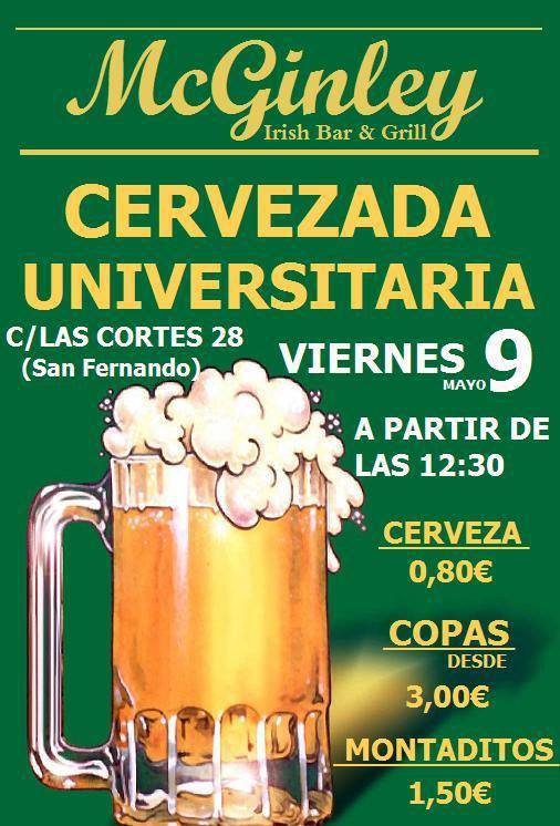 El bar irlandés McGinley Irish Bar & Grill, ubicado en la calle Las Cortes nº 28, este viernes 9 de mayo tendrá su propia y primera Cervezada Universitaria a partir de las 12.30 horas. Entrada libre.