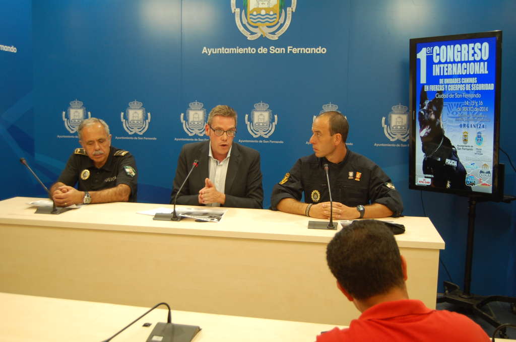 congreso canino seguridadEl teniente de alcalde de Presidencia y Ciudadanía, Daniel Nieto, el intendente de la Policía Local de San Fernando, José Suraña, y el responsable de la Unidad de Canina de la Policía Local isleña, Joaquín Rodríguez Coronilla, han presentado el programa del I Congreso Internacional de Unidades Caninas en Fuerzas y Cuerpos de Seguridad, evento que tiene previsto celebrarse los próximos días 14, 15 y 16 de mayo en la ciudad y que está organizado por el propio Ayuntamiento y la Policía Local.